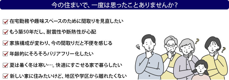 「今の家が寒い」「設備が古くて使いにくい」「間取りが暮らしに合っていない」――そんな住まいのお悩みをお持ちの方へ。
