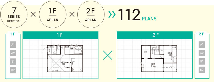 敷地条件や家族構成に合わせて、112通りの間取りから選択可能。理想の暮らしに“ちょうどいい”住まいが見つかります。