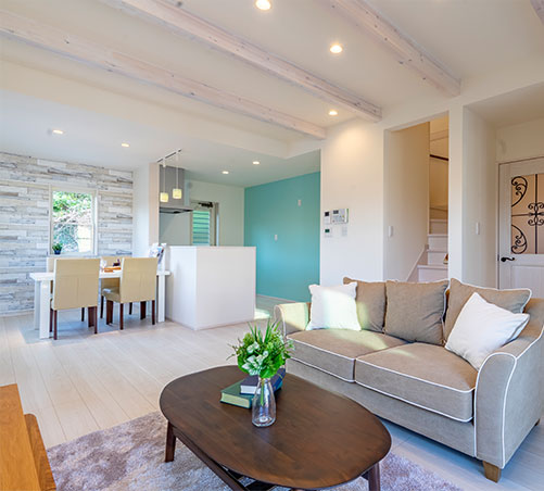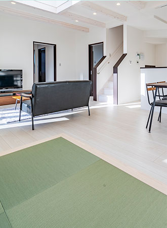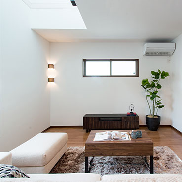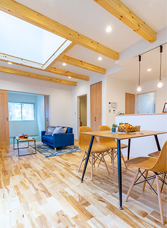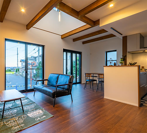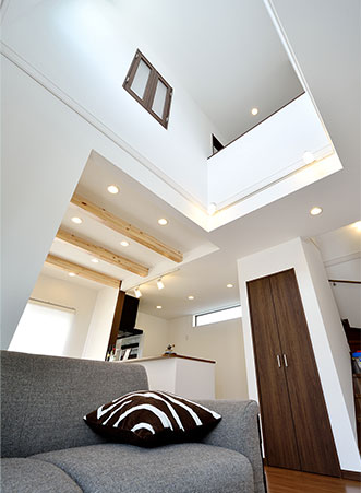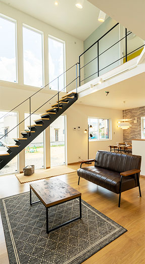 大きな窓や吹抜けを取り入れ、自然の光と風を感じられる明るい住まい。毎日の暮らしが心地よく広がります。